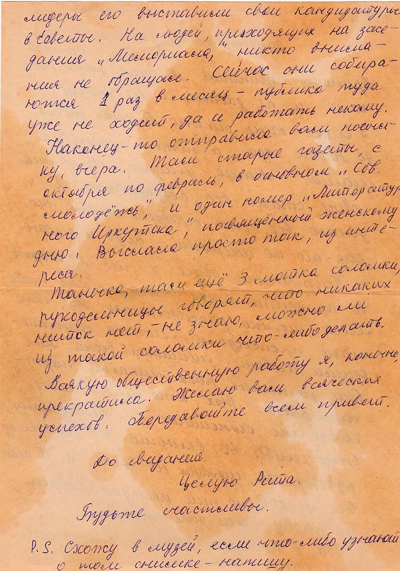 Наконец-то отправила вам посылку, вчера. Там старые газеты, с октября по февраль, в основном «Сов. Молодёжь», и один номер «Литературного Иркутска», посвященный женскому дню, Высылаю просто так, из интереса.