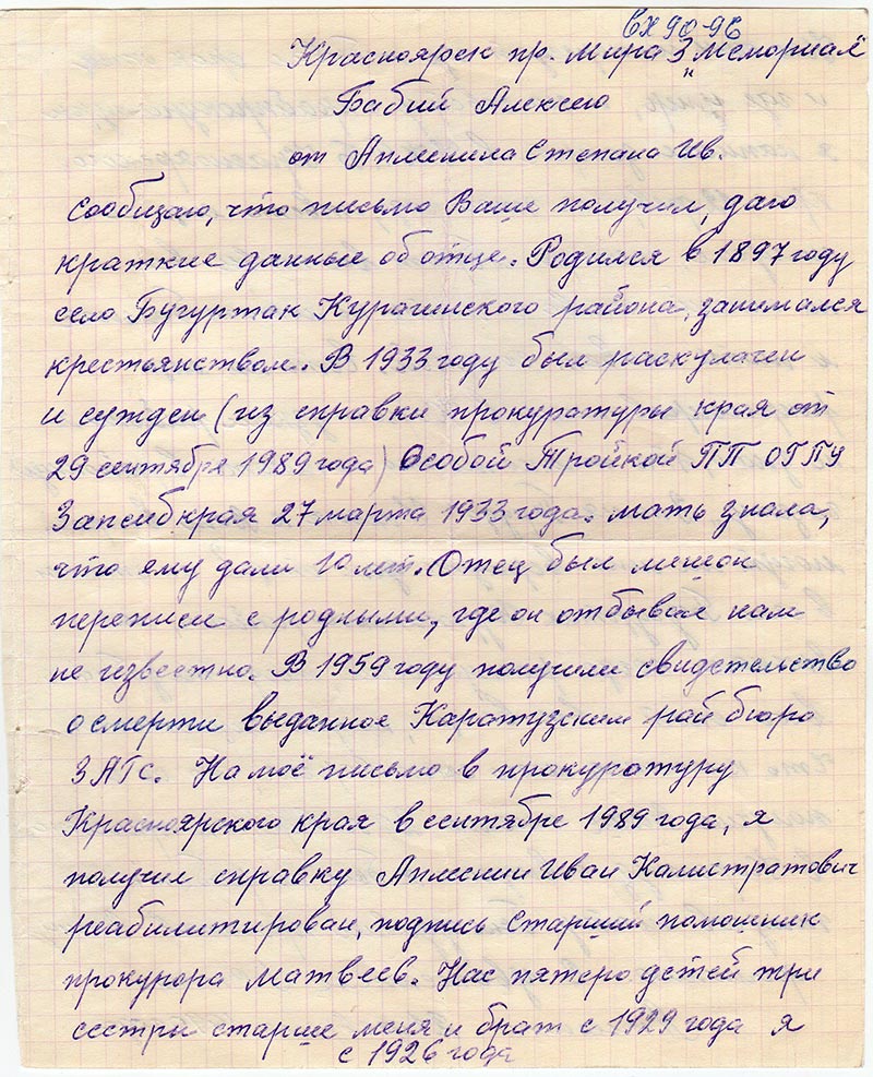Сообщаю, что письмо Ваше получил, даю краткие данные об отце. Родился в 1987 году село Бугуртак Курагинского района, занимался крестьянством. В 1933 году был раскулачен и сужден (из справки прокуратуры края от 29 сентября 1989 года) Особой Тройкой ПП ОГПУ Запсибкрая 27марта 1933 года. Мать знала, что ему дали 10 лет. Отец был лишон переписи с родными, где он отбывал нам не известно. В 1959 году получили свидетельство о смерти выданное Каратузским рай бюро ЗАГС. На моё письмо в прокуратуру Красноярского края в сентябре 1989 года, я получил справку Аплеснин Иван Калистратович реабилитирован, подпись старший помошник прокурора Матвеев. Нас пятеро детей три сестры старше меня и брат с 1929 года я с 1926 года.