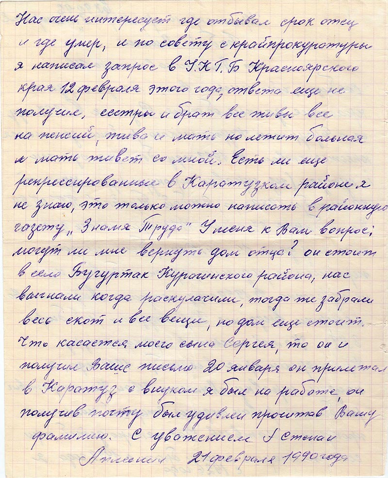 Нас очень интересует где отбывал срок отец и где умер, и по совету с крайпрокуратуры я написал запрос в У.К.Г.Б Красноярского края 12 февраля этого года, ответа еще не получил, сестры и брат все живы все на пенсий, жива и мать но лежит больная л мать живет со мной. Есть ли еще репрессированные в Каратузком районе я не знаю, это только можно написать в районную газету «Знамя Труда» У меня к Вам вопрос: могут ли мне вернуть дом отца? Он стоит в село Бугуртак Курагинского района, нас выгнали когда раскулачили, тогда же забрали весь скот и все вещи, но дом еще стоит.