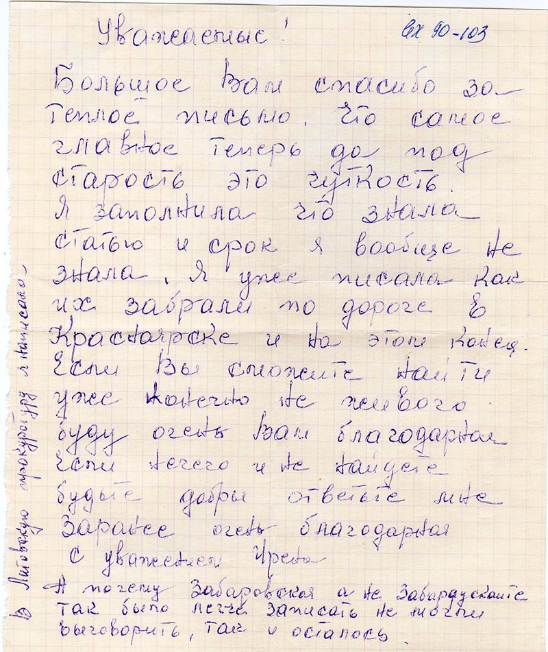 Большое Ва спасибо за теплое письмо. Что самое главное теперь да под старость это чуткость. Я заполнила что знала. Я уже писала как их забрали по дороге в Красноярске и на этом конец. Если Вы сможите найти уже конечно не живого буду очень Вам благодарна. Если нечего и не найдете будьте добры ответьте мне. Заранее очен благодарная