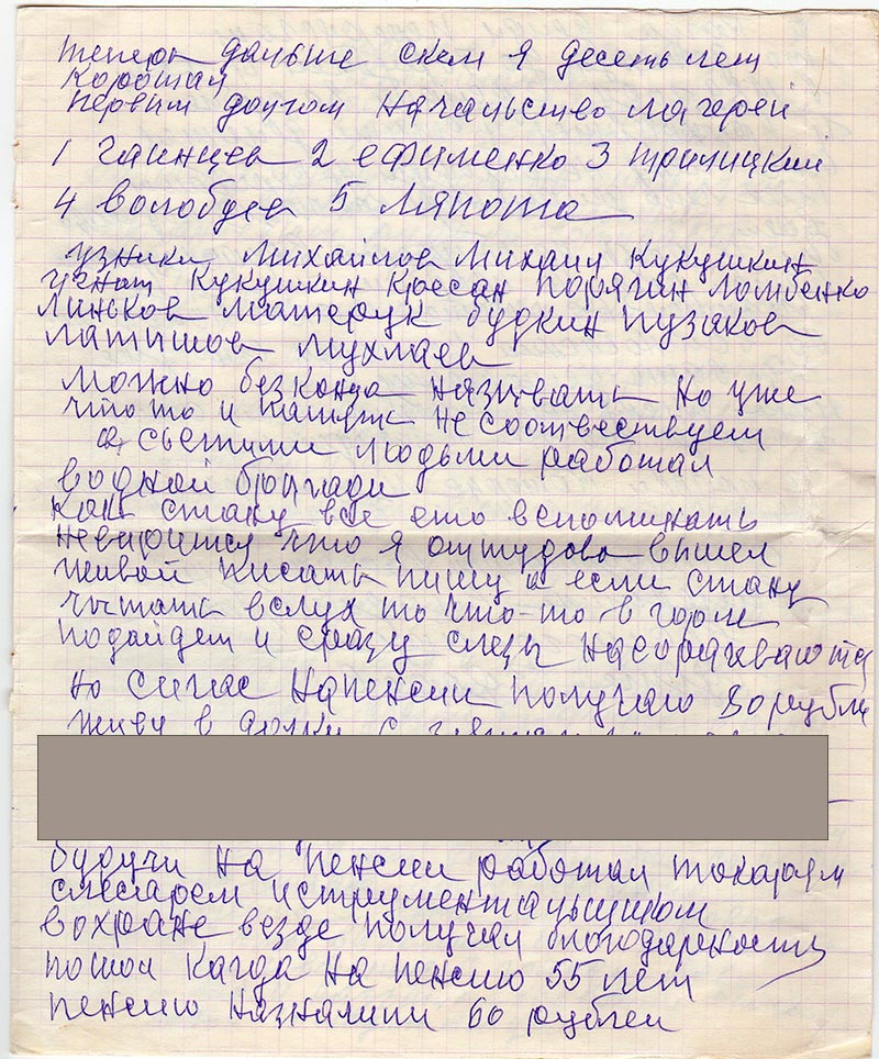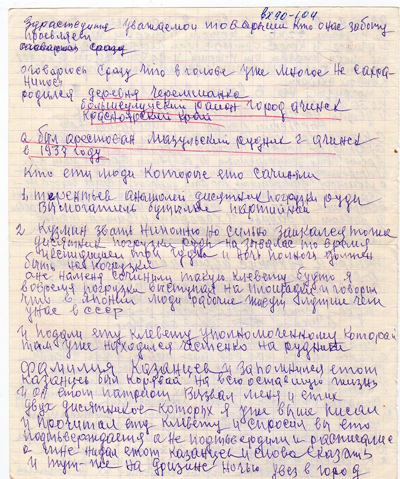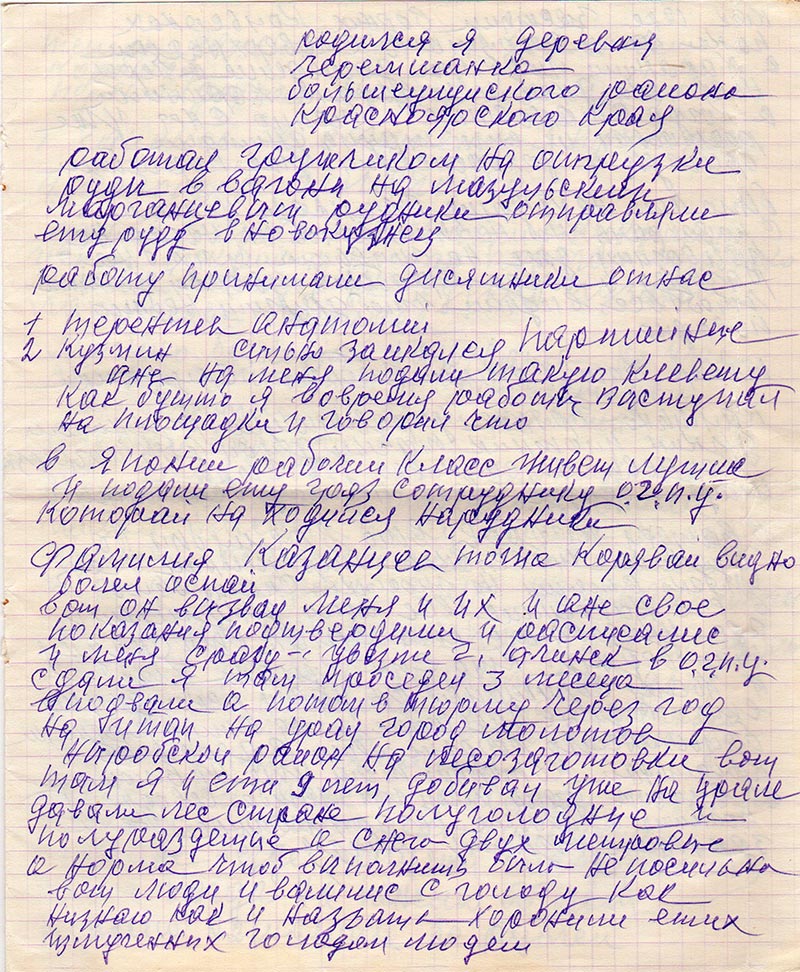 Фамилия Казанцев и запомнился етот Казанцев был корявай на всю оставшую жизнь и он етот патриот вызвал меня и етих двух дисятников которых я уже выше писал и прочитал ету клевету и спросил вы ето подтьверждаете а не подтьвердили и расписалис а мне нидал етот Казанцев и слова сказать и тут же на дризине ночью увез в город Ачинск в г.п.у. И вот я три месеца сидел в подвали г.п.у. а потом в тюрму перевели г. Ачинск И когда отправляли через год на итак то люди стоят от тюрмы и до станции Ачинск первай по оби стороны унавали своих когда нас вели конвой сабаки и погрузили нас в вагоны вагон емкость 16 тон по 36 человек