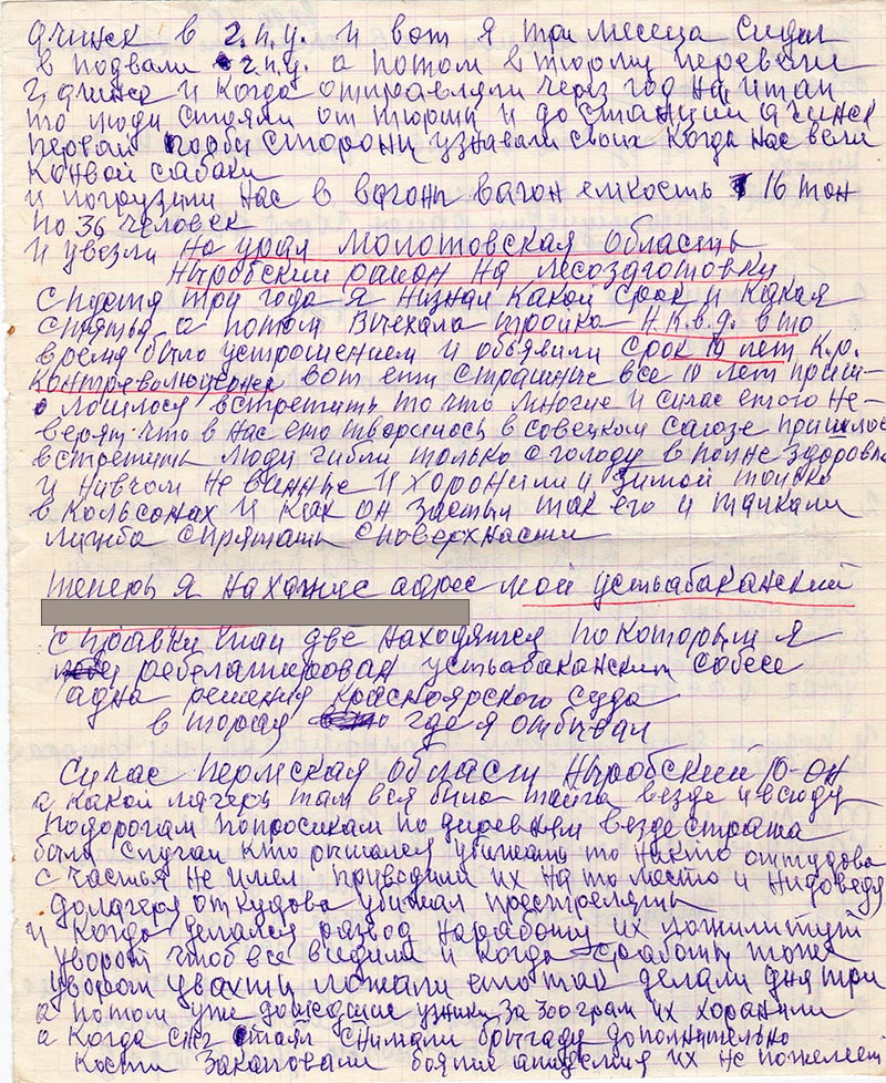 вот он вызвал меня и их и ане свое показания подтвердили и расписалис и меня сразу – увезли г. Ачинск в о.г.п.у. сдали. Я там проседел 3 месеца в подвали а потом в тюрму через год на итап на урал город молотов Ныробскои раион на лесозаготовки вот там я и ети 9 лет добивал уже на урале давали лес стране полуголодные полураздетие а снега двух метровые а норма чтоб выполнить было не посильна вот люди и валилис с голоду как низнаю как и назвать – хоронили етих измученних голодом людеи