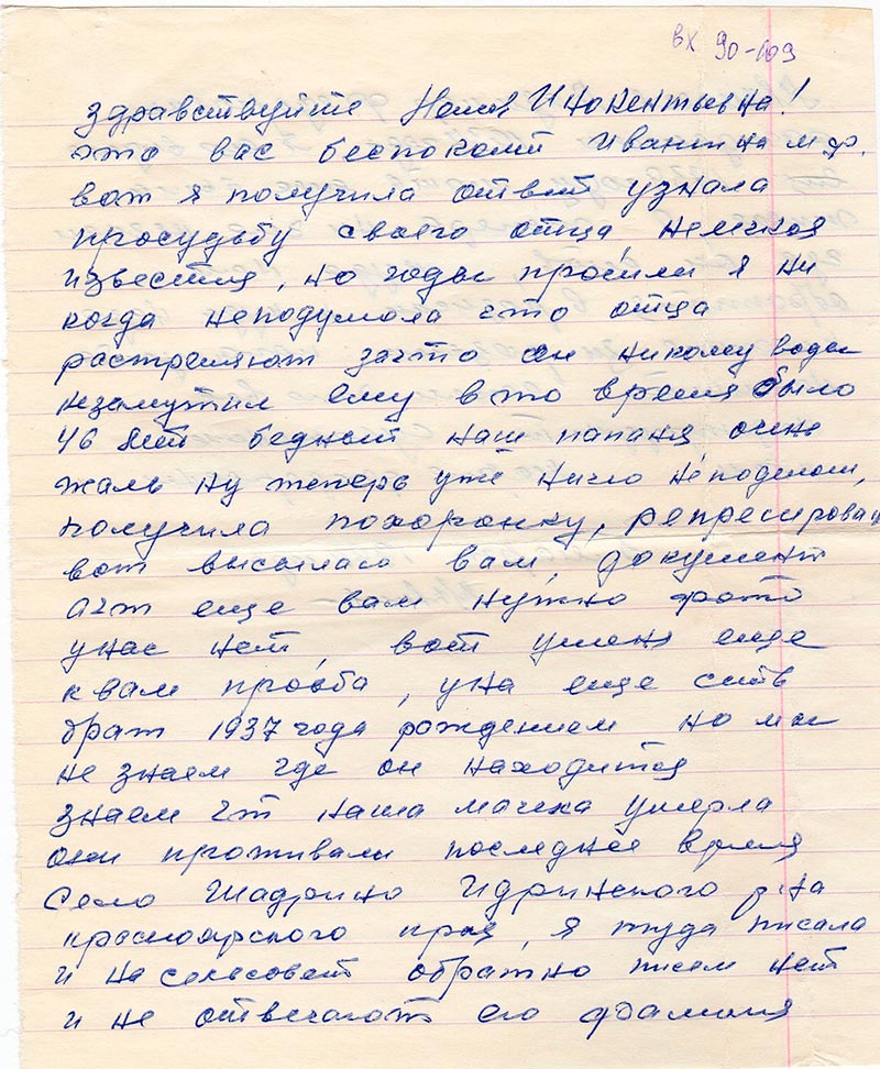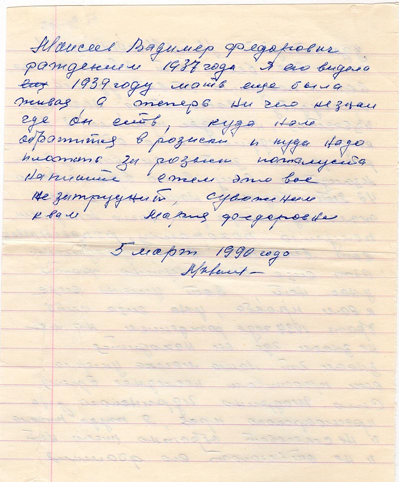 Вот я получила ответ узнала просудьбу своего отца, немчкоя известия, но годы прошли я ни когда неподумала что отца растреляют зачто он никому воды незамутил ему в то время было 46 лет бедный наш папаня, очень жаль ну теперь уже ничего не поделаш, получила похоронку, репресирован Вот высылаю вам, документ акт еще вам нужно фото унас нет, вот уменя еще к вам просьба, уна еще есть брат 1937 года рождением но мы не знаем где он находится знаем чт наша мачеха умерла они проживали последнее время село Шадрино Идринского р-на Красноярского края, я туда писала и на сельсовет обратно писем нет и не отвечают его фамилия Маисеев Вадимер Федорович раждением 1937 года я его видела 1939 году мать еще была живая, а теперь ни чего не знал где он есть, куда нам обратится в розыски и куда надо плотить за розыск пожалуйста напишите ежели это вас не затруднит,