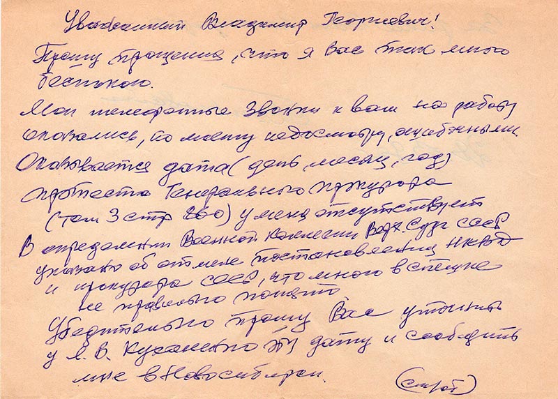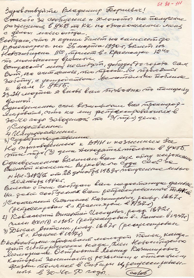 На приговоренных к ВМН и казненных все эти три (3) дела находятся только в УКГБ. Одновременно высылаю вам еще одну ксерокопию Военной коллегии Верховного суда СССР за №НН-31925156 от 28 декабря 1989г полученное мною 10 января 1990г.