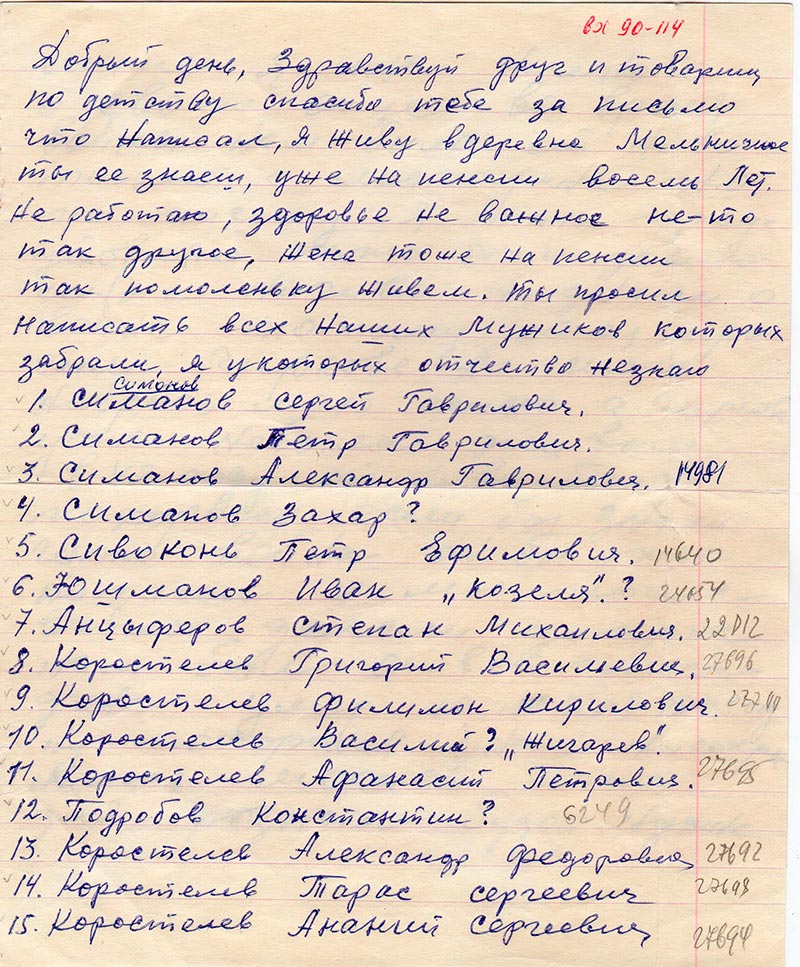 Добрый день, Здравствуй друг и товарищ по детству спасибо тебе за письмо что написал, я живу в деревне Мельничное ты ее знаешь, уже на пенсии восемь лет. Не работаю, здоровье не важное не-то так другое, жена тоже на пенсии так помоленьку живем. Ты просил написать всех наших мужиков которых забрали у которых отчество незнаю