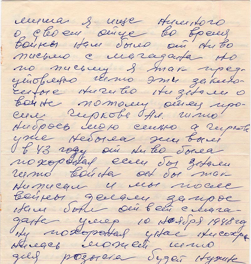 Миша я еще немного о своем отце во время войны нам было от ниво письмо с Магадана но по письму я так представляю что эти заключенные ничиво ни знали о войне потому отец просил Чиркова Ал. Што нибрось мою семью а Чиркова уже небыла живым.