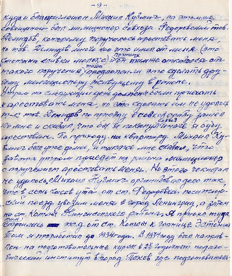 Утром на следующий день должны были приехать и арестовать меня, но это сделать им не удолось т-к тов. Демидов по приезду в совхоз сразу зашёл ко мне и сказал, что бы я покинул совхоз иначе я буду арестован. По приходу на квартиру Михаил Кузмич был уже дома, и также мне сказал, что завтра утром приедет из района милиционер с поручением арестовать меня. Но этого чекистам не удалось. Михаил Кузмич организовал дело так, что в семь часов ута от ст. Федоровка пасажирский поезд увозил меня в город Ленинград, а затем на с. Котлы Кингисепского района. Я приехал туда там строилась ж.д. от ст. Котлы к границе Эстонии. Там я проработал до 1934 года. В 1934 году был направлен на подготовительные курсы в 2-х годичный педагогический институт в город Псков где подготовительные курсы я прослушал, но экзамены не выдержал и по этому зачислен в 2-х годичный институт не был; но в этом же году с помощью знакомых мне ребят Петрова Александра и Федорова Александра по национальности они оба были ижоры это, что-то вроде эстонцев, я был принят в Ленинградский рыбопромышленный техникум на гидротехническое отделение. Техникум я закончил успешно диплом защитил на отлично и был направлен в Тамбовский Госрыбтрест где был зачислен на должность старшего гидротехника. Проработал два года и в ине 1940 года был призван на действительную службу в армию, через год началась война с немцами. Конечно, все ужасы войны поймет по настоящему только тот человек, который пройдет через горнило войны, ни книги не кинофильмы не доведут человека до такого ощущения, которое он испытывает собственным чувством находясь непосредственно в гормиле жестокого боя. На передовой я провоевал до конца октября за это время наш полк два раза выходил из окружения ведя ожесточенные бои. В одном из боев при отступлении меня постигло как и многих других роковое несчастье я был пленен. Плен это тягчайшее существование в лучшем случае, а как правило для многих – голодная смерть, как это было в лагеря, в которы пришлось побывать мне. Будучи в лагере военнопленных работали на лесоповале, на разработке каменного карьера на территории Норвегии в районе города Киргинеса. Мысли о Родине не оставляли каждого из нас ни на одну минуту. Академик Тарле в одной из своих статьей утверждал, что побег из плена – есть великий подвиг достойный высшей награды, не претендуя на последнее многие решали в том числе и я, лучше умереть стоя чем жить на коленьях всю жизнь.