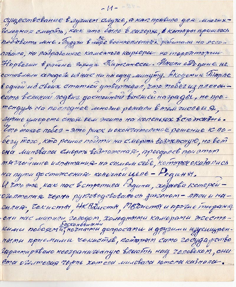 И что же, как нас встретила Родина, хозяева которой – оголтелая чернь руководствовалось законом – лжи и насилия, чекисты, НКВДисты, ТВДисты и прочие тираны они нас морили голодом, холодными камерами жесткими побоями, бесконечными ночными допросами и другими изухищренными приемами чекистов, которым само государство гарантировало неограниченную власть над человеком, они эта оголтелая чернь хотела миловала хотела казнила.