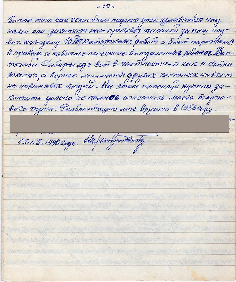После того как чекистам надоело уже измываться над нами они зачитали нам приговор палачей за наш подвиг каждому 10 ть лет каторжных работ и 5 лет парожения в правах и навечное поселение в отдаленные районы Восточной Сибири, где вот в частности – я как и сотни тысяч, а вернее миллионы других честных ни в чем не повинных людей. На этом пожалуй нужно закончить далеко не полное описания моего тернового пути. Реабилитацию мне вручили в 1958 году.