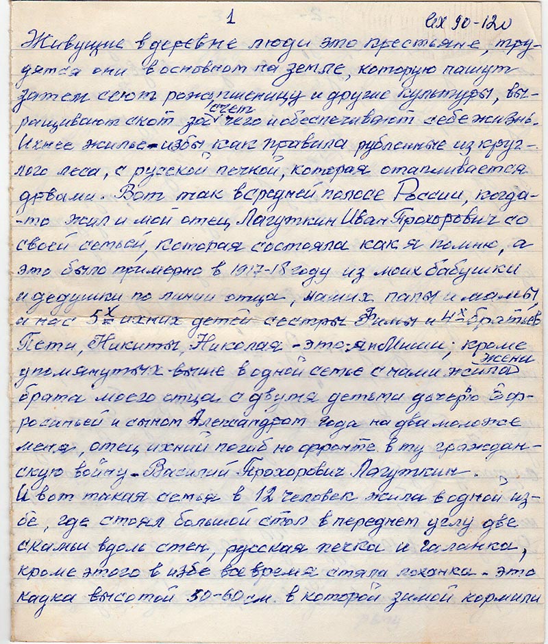 Живущие в деревне люди это крестьяне, трудятся они в основном на земле, которую пашут затем сеют рожь, пшеницу и другие культуры, выращивают скот, за счет чего и обеспечивают себе жизнь. Ихнее жилье – избы как правила рубленные из круглого леса, с русской печкой, которая отапливается дровами. Вот так в средней полосе России, когда-то жил и мой отец Лагуткин Иван Прохорович со своей семьей, которая состояла как я помню, а это было примерно в 1917-18 году из моих бабушки и дедушки по линии отца, наших папы и мамы, и нас 5-х ихних детей сестры Фимы и 4-х братьев Пети Никиты, Николая – это я и Миши; кроме упомянутых выше в одной семье с нами жила жена брата моего отца с двумя детьми дочерью Ефросиньей и сыном Александром года на два моложе меня, отец ихний погиб на фронте в ту гражданскую войну – Василий Прохорович Лагуткин.