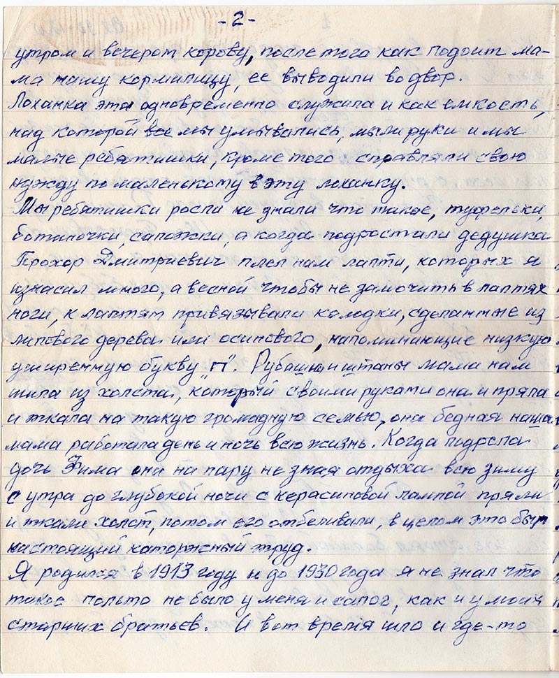 Мы ребятишки росли не знали что такое, туфельки, ботиночки, сапожки, а когда подрастали дедушка Прохор Дмитриевич плел нам лапти, которых я изнасил много, а весной чтобы не замочить в лаптях ноги, к лаптям привязывали колодки, сделанные из липового дерева или осинового, напоминающие низкую уширенную букву «П». Рубашки и штаны мама нам шила из холста, который своими руками она и пряла и ткала на такую громадную семью, она бедная наша мама работала день и ночь всю жизнь. Когда подросла дочь Фима они на пару не зная отдыха всю зиму с утра до глубокой ночи с керасиновой лампой пряли и ткали холст, потом его отбеливали, в целом это был настоящий каторжный труд.