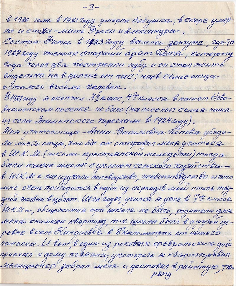 В 1927 году я окончил 3-й класс, 4-го класса в нашем Новознаменском поселке не