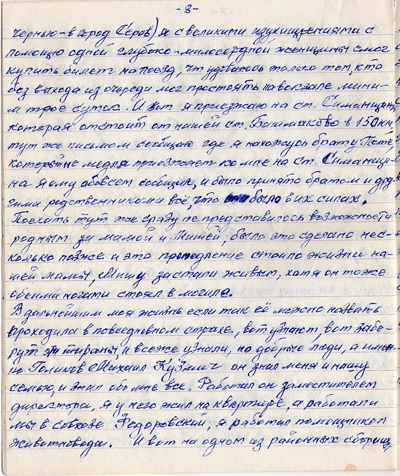 В дальшейшим моя жизнь если так её можно назвать проходила в повседневном страхе, вот узнают, вот заберут эти тираны, и всеже узнали, но добрые люди, а именно Голиков Михаил Кузмич он знал меня и нашу семью, и знал обо мне все. Работал он заместителем директора, я у него жил на квартире, а работали мы в совхозе Федоровский, я работал помощником животновода. И вот на одном из районных сборищ, куда и был приглашон Михаил Кузмич, на этом же совещании был милиционер совхоза Федоровский тов. Демидов, которому поручалось арестовать меня, но тов. Демидов много кое что имел от меня (это сметана сливки молоко) и поэтому он там же отказался от такого поручения, тогда предложили это сделать другому мелиционеру живущему в районе.