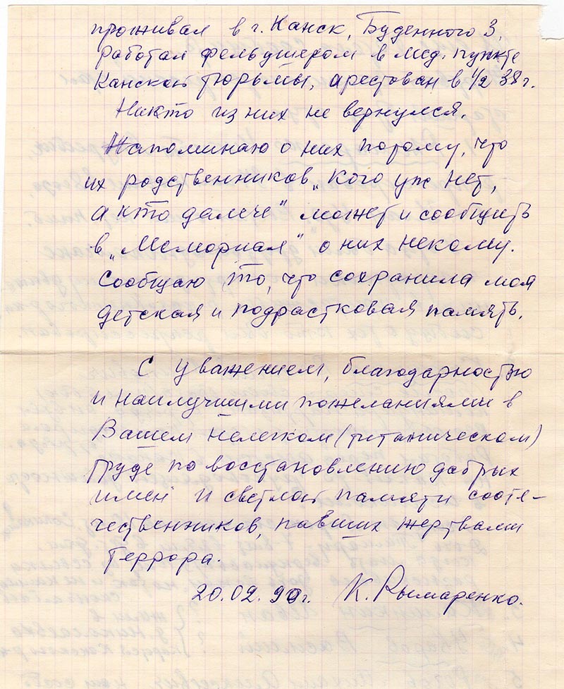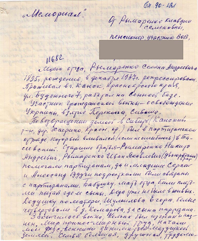 Моего отца Рымаренко Семена Андреевича 1985 г. рождения, в декабре 1937г. репрессировали. Проживал в г. Канск Красноярского края, ул. Будённого, 7, работал на Сенной базе.
