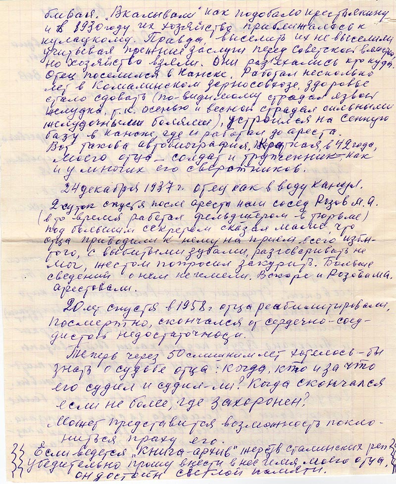 Если ведется «книга-архив» жертв сталинских репрессий, убедительно прошу внести в нее имя моего отца, он достоин светлой памяти.