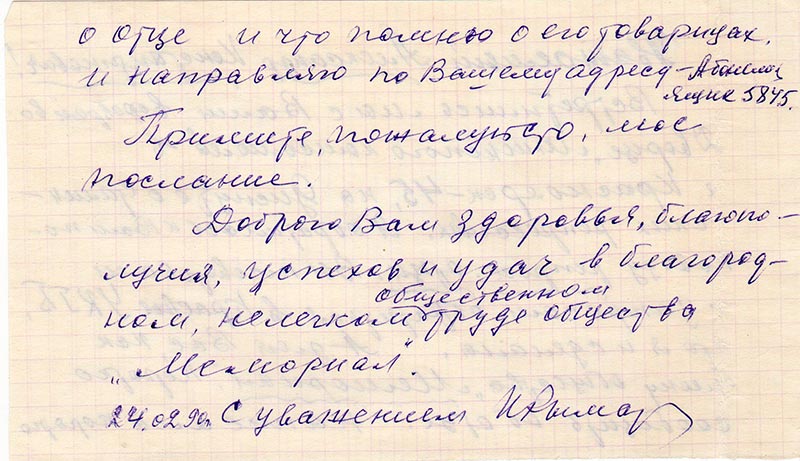 Доброго Вам здоровья, благополучия, успехов и удач в благородном, нелегком общественном труде общества «Мемориал».