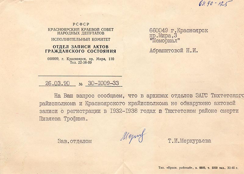 1932-1938 годах в Тюхтетском районе смерти Пизяева Трофима.
