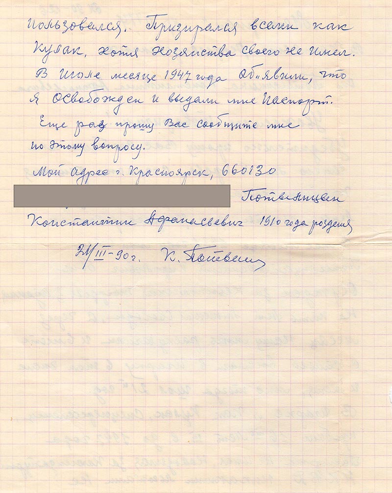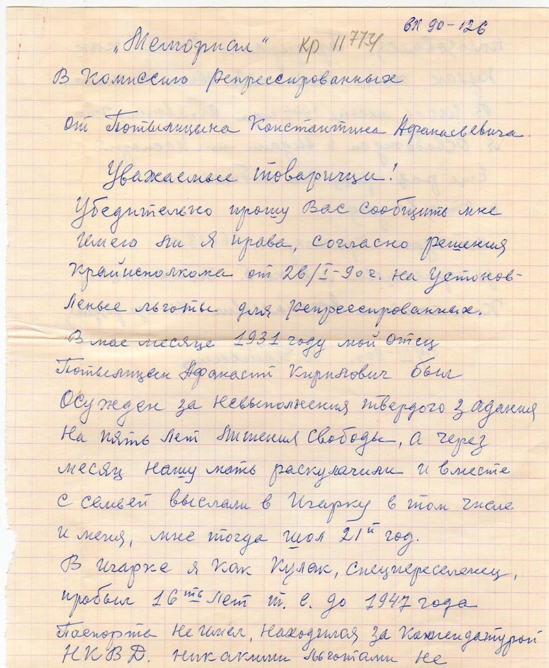 Убедительно прошу Вас сообщить мне имею ли я права, согласно решения крайисполкома от 26/I – 90 г. на устоновленые льготы для репрессированных. В мае месяце 1931 году мой отец Потылицын Афанасий Кирилович был осужден за невыполнения твердого задания на пять лет лишения свободы, а через месяц нашу мать раскулачили и вместе с семьей выслали в Игарку в том числе и меня, мне тогда шол 21й год.