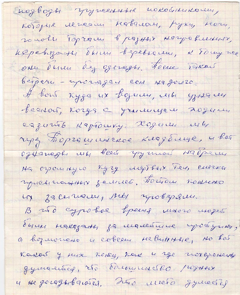 В то суровое время много людей были наказаны за малейшие проступки, а возможно и вовсе невинные, но вот какой у них конец, как и где похоронены думается, что большинство родных и не догадываются. Это место думается найти не трудно. Это с левой стороны кладбища. Только думается мне, что там теперь садовые участки, давно не бывала. Если это вас заинтересует, то я могу это место показать.