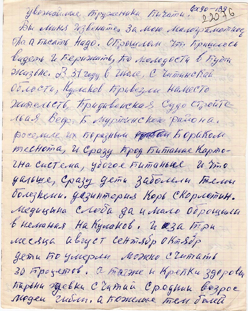 В 31 году в Шоле, С Читинскай облости, Кулаков привезли наместо жительств, Придивенская Судо стройтельяая Веф, Б. Муртинского района. роселиле их поразным бораком теснота, и сразу прод питание карточна система, убогое питаньие и что дальше, сразу дети заболели теми болезнеми. дезинтерия Корь скорлотин. Медицина слоба да и мало оброщала в немания на Кулаков. И за три месяца август сентябр октябр дети по умерли можно считать 30 процетов. а тагже и крепки здоровы парьни девки считай среднии возрос людеи гибли, а пожелые тем болей умерали. Сталинска Ягодовска коса роботала не умолимо.