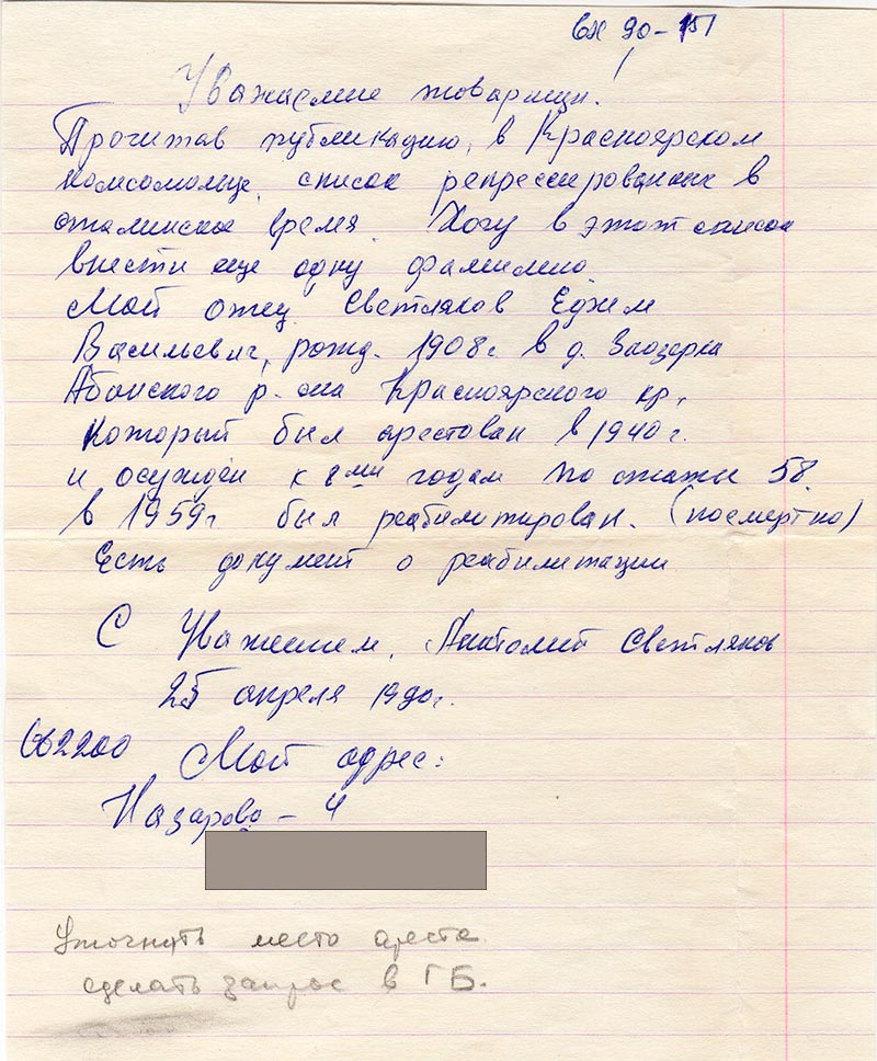 Прочитав публикацию в «Красноярском комсомольце» список репрессированных в сталинское время. Хочу в этот список внести еще одну фамилию.