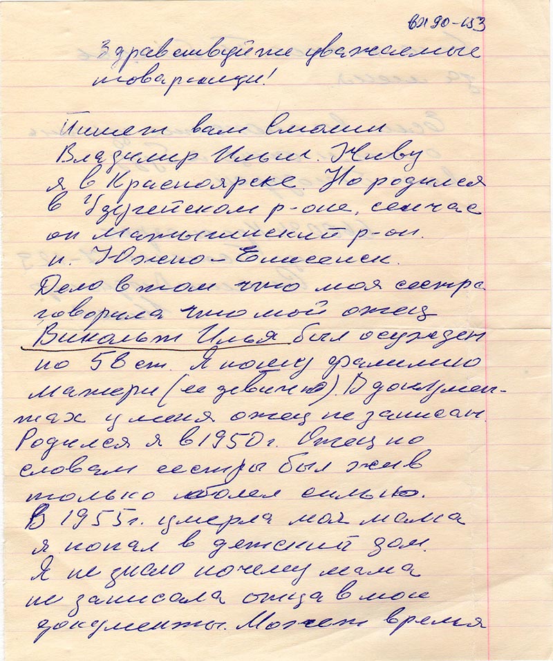 Дело в том что моя сестра говорила что мой отец Викольт (ВИнольт)Илья был осужден по 58 ст. Я ношу фамилию матери (ее девичью). В документах у меня отец не записан. Родился я в 1950 г. Отец по словам сестры был жив только болел сильно.