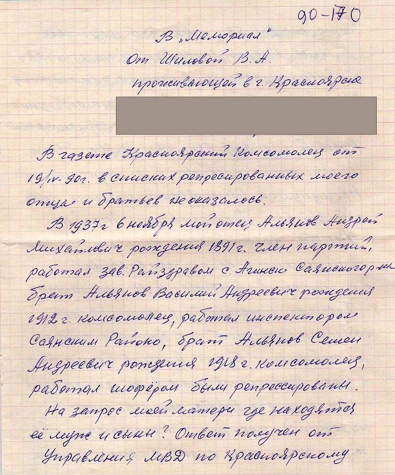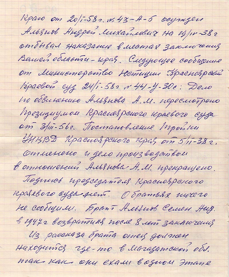 На запрос моей матери где находятся её муж и сыны? Ответ получен от Управления МВД по Красноярскому краю от 20/I-58 г. № 43-А-5 осужден Альянов Андрей Михайлович на 19/IV-38 г. отбывал наказание в местах заключения Вашей области – края. Следующее сообщение от Министерство Юстиции Красноярский Краевой суд 24/I-58 г. № 44-У-30с: Дело по обвинению Альянова А.М. пересмотрено Президиумом Красноярского краевового суда от 3/III-56 г. Постановление Тройки УНКВД Красноярского края от 5/II-38 г. отменено и дело производством в отношений Альянова А.М. прекращено. Подпись председателя Красноярского краевого суда нет. О братьях ничего не сообщили. Брат Альянов Семен Анд. в 1947 г. возвратился после 8 лет заключения.