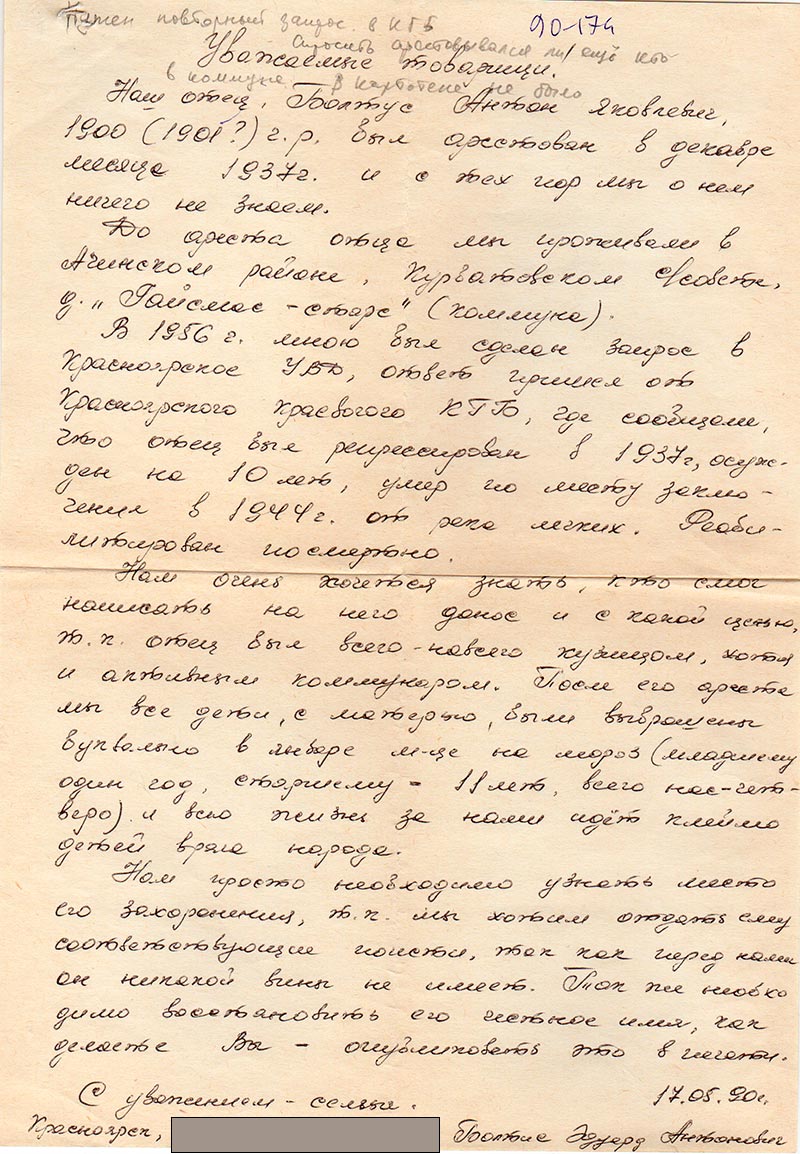 В 1956 г. мною был сделан запрос в Красноярское УВД, ответ пришёлся от Красноярского краевого КГБ, где сообщили, что отец был репрессирован в 1937 г., осуждён на 10 лет, умер по месту заключения в 1944 г. от рака лёгких. Реабилитирован посмертно.