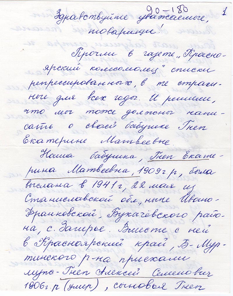 Наша бабушка, Гнеп Екатерина Матвеевна, 1909 г.р., была выслана в 1941 г., 22 мая из Станиславской обл., ныне Ивано-Франковской, Букачёвского района, с. Загирье. Вместе с ней в Красноярский край, Б-Муртинскогор-на приехали муж- Гнеп Алексей Семенович, 1906 г.р.(умер), сыновья Гнеп Андрей Алексеевич (1933 г.р.), Гнеп Роман Алексеевич. (Ещё высланы были мать бабушки, сестра и брат Осип - умерли).