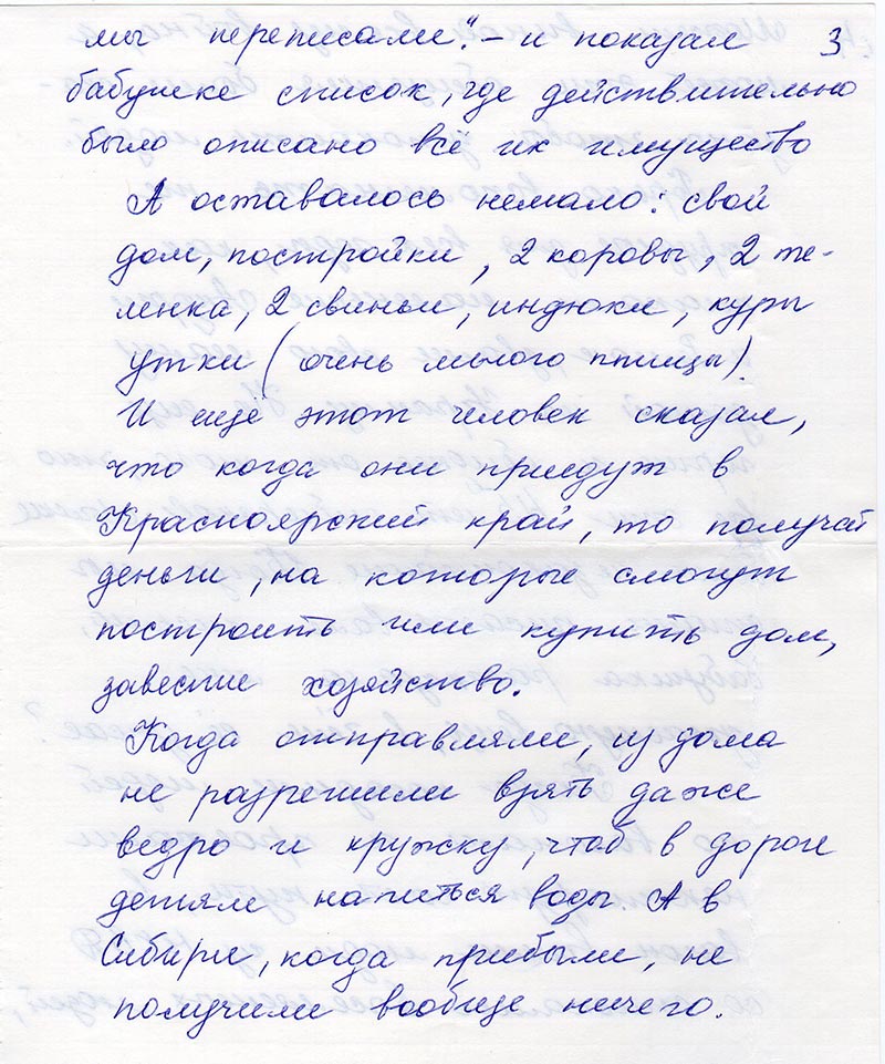 «Не плачьте, хозяйка, вас выселяют в Красноярский край. Всё, что вы здесь оставляете мы переписали.» - и показал бабушке список, где действительно было описано всё их имущество.