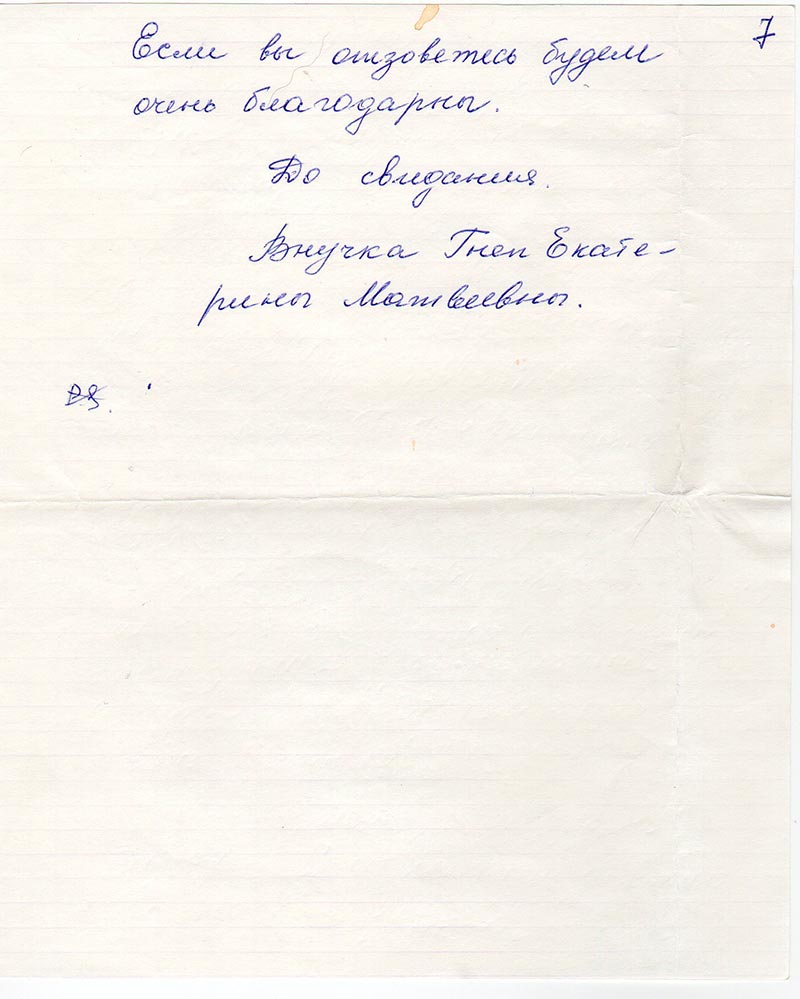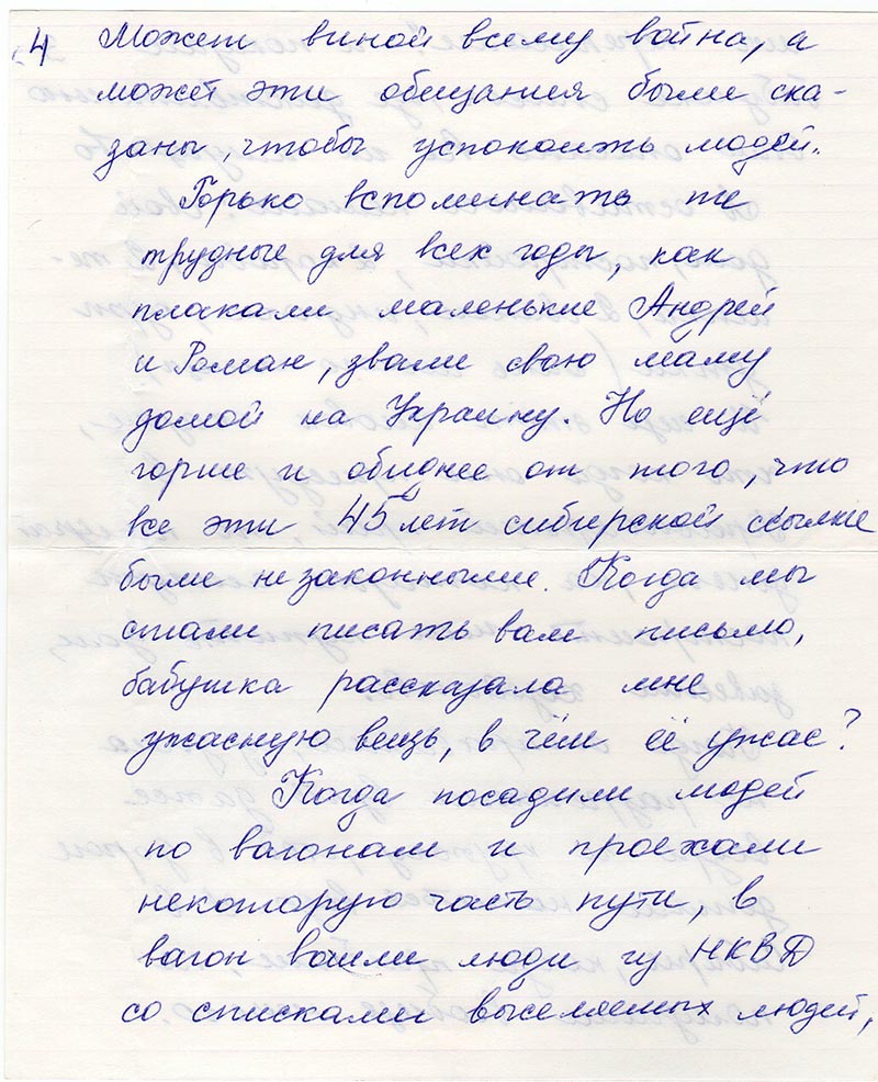 Горько вспоминать те трудные для всех годы, как плакали маленькие Андрей и Роман, звали свою маму домой на Украину. Но ещё горше и обиднее от того, что все эти 45 лет сибирской ссылки были не законными. Когда мы стали писать вам письмо, бабушка рассказала мне ужасную вещь, в чём её ужас?