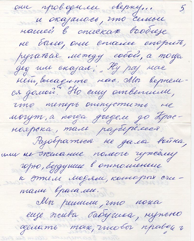 И оказалось, что семьи нашей в списках вообще не было, они стали спорить, ругаться между собой, а тогда дед им сказал: «Ну раз нас нет, высадите нас. Мы вернемся домой.» Но ему ответили, что теперь отпустить не могут, а когда доедем до Красноярска, там разберёмся.