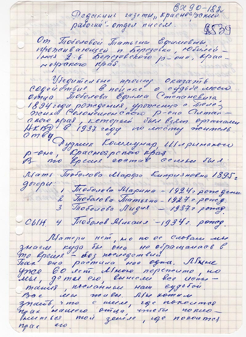 Убедительно прошу оказать содействие в поиске о судьбе моего отца Тоболова Ефима Степановича, 1894 года рождения, уроженца с. Тележиха Солонешенского р-она Алтайского края, который был взят органами НКВД в 1937 году по месту жительства.