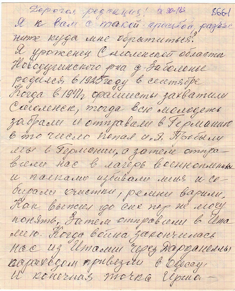 Когда в 1941 г. фашисты захватили Смоленск, тогда всю молодежь забрали и отправили в Германию в то число попал и я. Прибыли мы в Германию, затем отправили нас в лагерь военнопленных и палками избивали меня и собирали очистки, ремни варили.