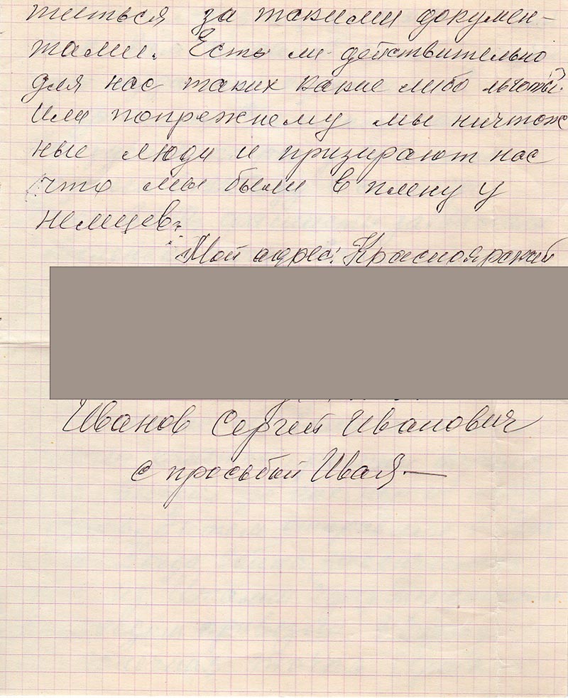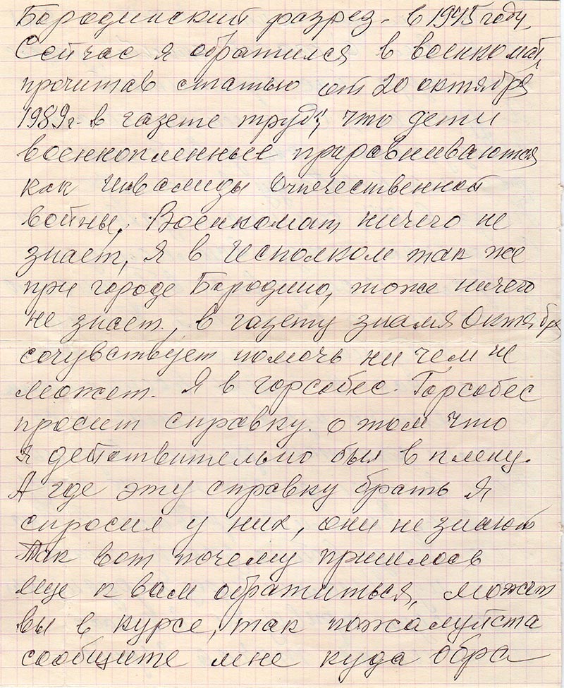 Сейчас я обратился в военкомат, прочитав статью от 20 октября 1989г в газете труд, что дети военнопленные приравниваются как инвалиды Отечественной войны. Военкомат ничего не знает, я в исполком так же при городе Бородино, тоже ничего не знает, в газету знамя Октября сочувствуют помочь ничем не может. Я в горсобес. Горсобес просит справку о том что я действительно был в плену. А где эту справку брать я спросил у них, они не знают.