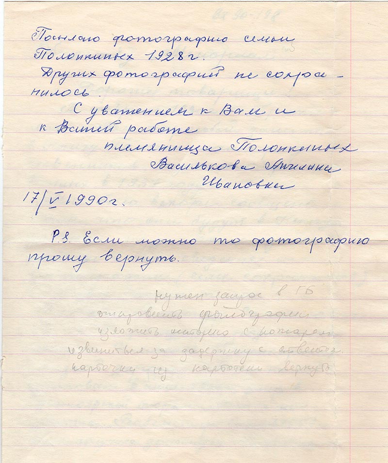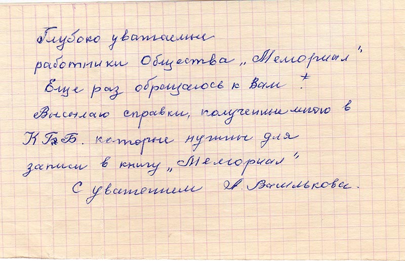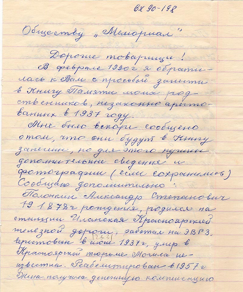 В феврале 1990 г. я обратилась к Вам с просьбой занести в Книгу Памяти моих родственников, незаконно арестованных в 1937 году.