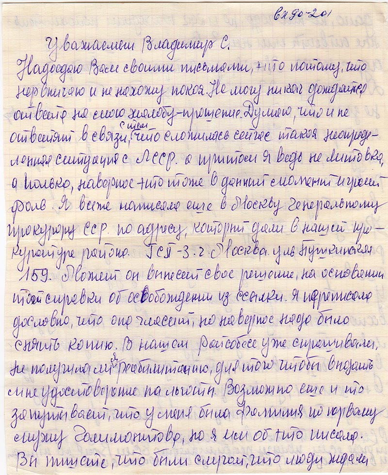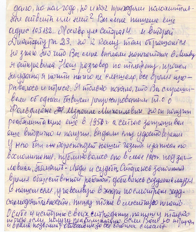 Надоедаю Вам своим письмом, нето потому, что нервничаю и не нахожу покоя. Не могу никак дождаться ответа на мою жалобу-прошение. Думаю, что и не ответят в связи с тем, что сложилась сейчас такая неопределенная ситуация с ЛССР. а притом я ведь не Литовка, а только, наверное это тоже в данный момент играет роль. Я все же написала еще в Москву генеральному прокурору ССР по адресу, который дали в нашей прокуратуре районе ГСП-3 г. Москва. Может он вынесет свое решение, на основании той справки об освобождении из ссылки. Я переписала дословно, что она гласит, но наверное надо было снять копию. В нашем райсобесе уже спрашивали, не получила ли я реабилитацию, для того чтобы выдать мне удостоверение на льготы. Возможно еще и то запутывает, что у меня была фамилия по первому мужу Голимонтова??, но я им об этом писала. Вы пишите, что были случаи, что люди ждали долго, по полгода, но и как приходили положительные ответы или нет? Вы мне пишете еще адрес, но к кому там обращаться не знаю. То что Вы мне выслали напечатаное в Литву я отправила. Наш разговор по телефону, прошел неудачно, я почти ничего не слышала, все время прерывалось и треск. Я только поняла, что Вы спрашивали об одном бывшем репрессированном т.е. о Фельдмане Израиле Михайловиче. Но он получил реабилитацию еще в 1956 г. а сейчас запрашивал еще вторично и получил, выдали ему удостоверение. У него был кореспондент нашей газеты и записал его воспоминания, публиковалась оно в мае 1989 г. под заголовком «Память - Люди и судьбы».