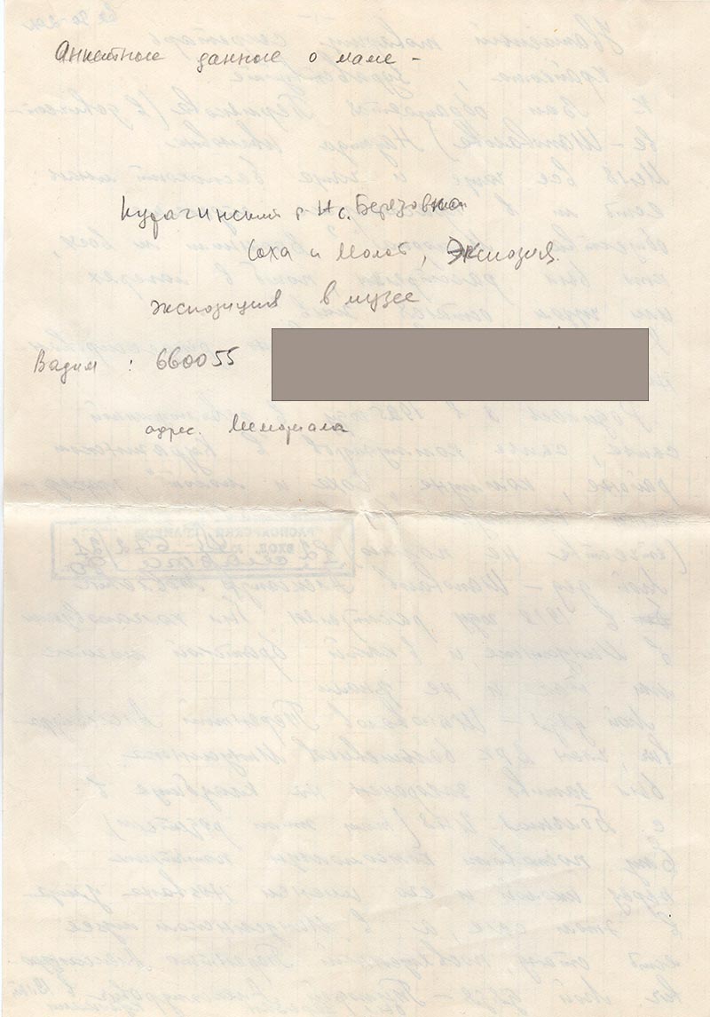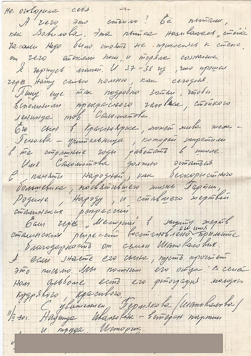 К Вам обращается Пермякова (в девичестве – Шаповалова) Надежда Ивановна. Меня все чаще и чаще беспокоит мысль: есть ли в Красноярске отделение общества «Мемориал»? Вспомнили ли всех, кто был расстрелян, погиб в лагерях или чудом остался жив?