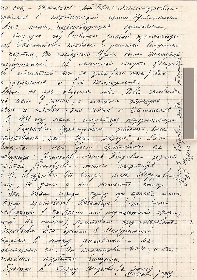 Мой отец – Шаповалов Иван Александрович сражался в партизанской армии Щетинкина. Моя мама, глубоковерующая крестьянка, в коммуне под влиянием умелой пропаганды тов. Соломатова порвала с религией, вступила в партию. До последнего вздоха была настоящей коммунисткой из ленинской когорты. Убежденной атеисткой. Мы ее дети (нас трое) все не крещенные и все коммунисты.