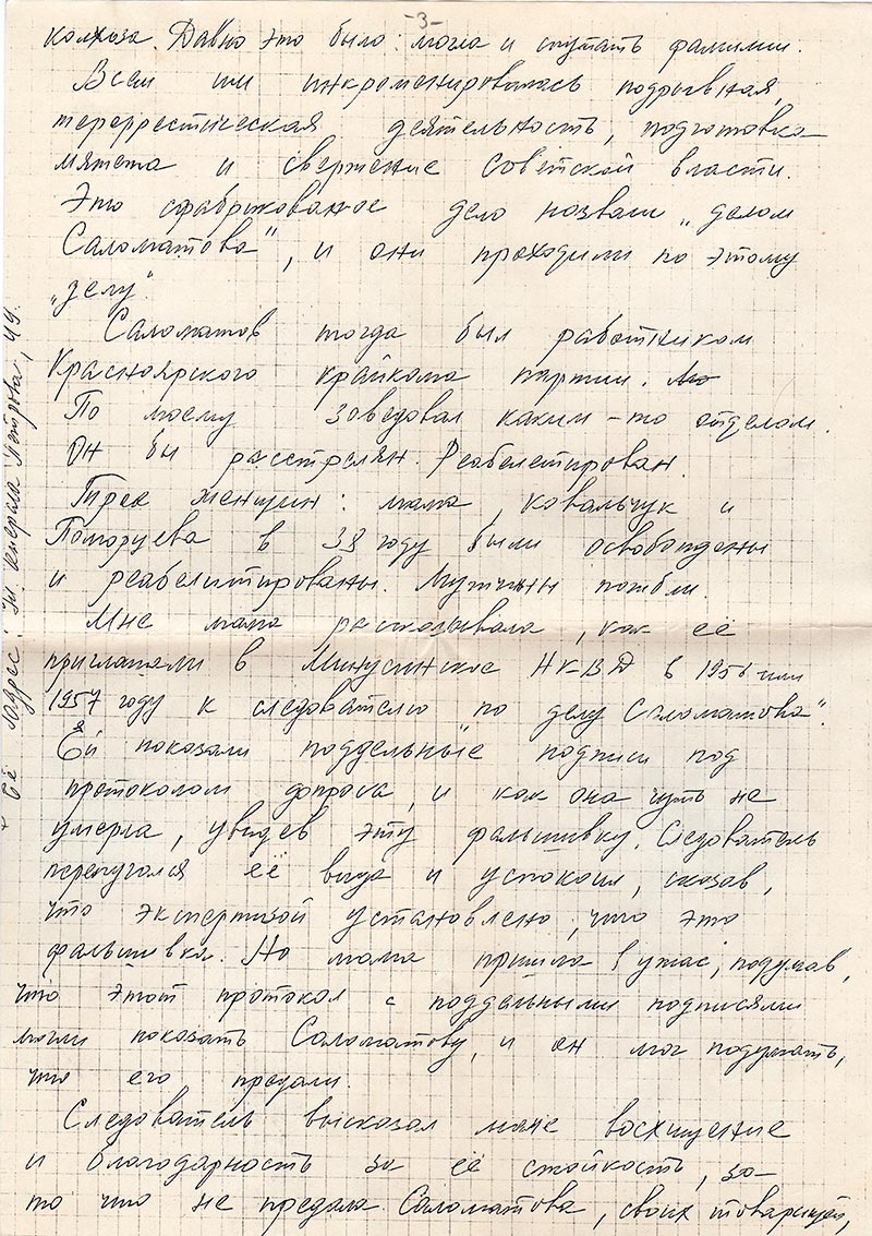 Мне мама рассказывала, как ее пригласили в Минусинское НКВД в 1956 или 1957 году к следователю «по делу Саломатова». Ей показали поддельные подписи под протоколом допроса, и как она чуть не умерла, увидев эту фальшивку. Следователь перепугался ее вида и успокоил, сказав, что экспертизой установлено, что это фальшивка. Но мама пришла в ужас, подумав, что этот протокол с поддельными подписями могли показать Саломатову, и он мог подумать, что его предали.