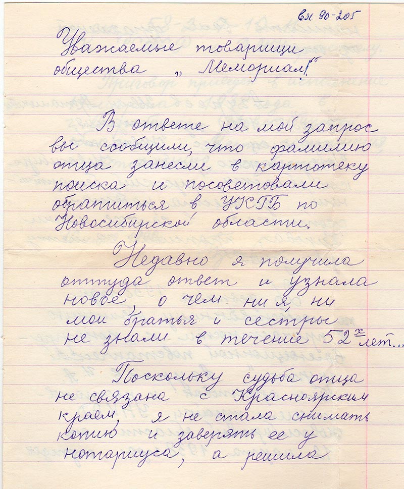 В ответе на мой запрос вы сообщили, что фамилию отца занесли в картотеку поиска и посоветовали обратиться в УКГБ по Новосибирской области.