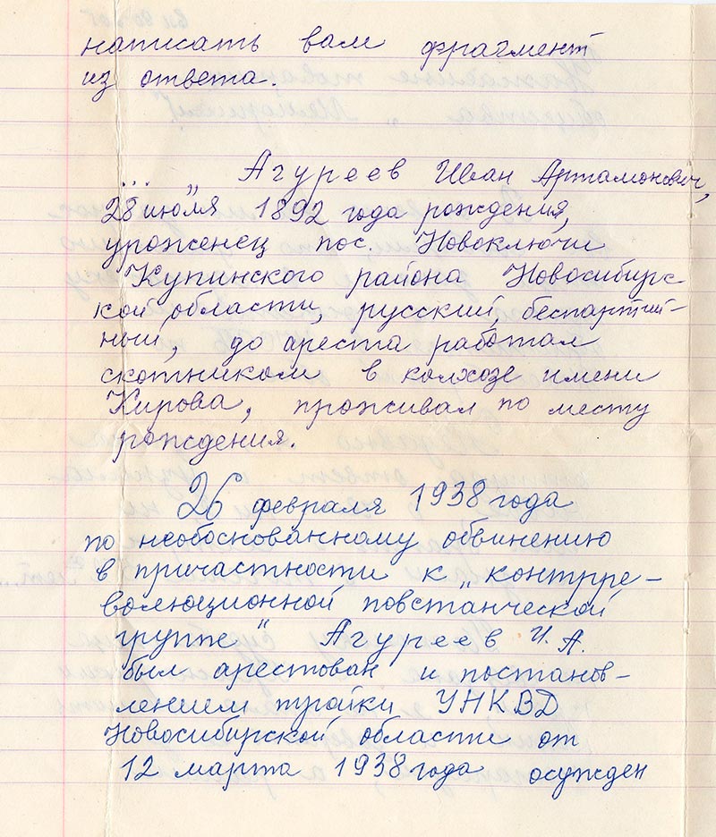 … «Агуреев Иван Артамонович, 28 июля 1892 гола рождения, уроженец пос. Новоключи Купинского района Новосибирской области, русский, беспартийный, до ареста работал скотником в колхозе имени Кирова, проживал по месту рождения.