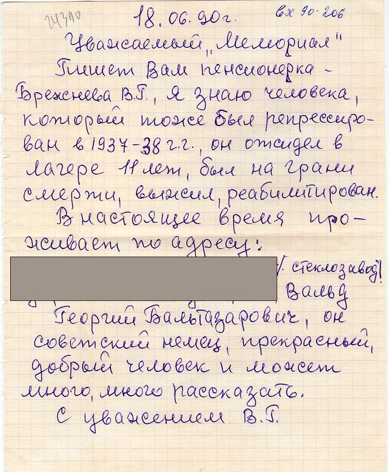 Пишет Вам пенсионерка – Брежнева В.Г., я знаю человека, который тоже был репрессирован в 1937-38 г.г., он отсидел в лагере 11 лет, был на грани смерти, выжил, реабилитирован.