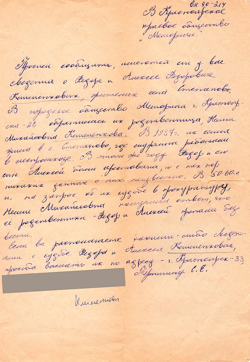 Просим сообщить, имеются ли у вас сведения о Федоре и Алексее Федоровиче Клименковых, жителя села Степаново. В городское общество Мемориал г. Красноярска-26 обратилась их родственница, Нелли Михайловна Клименкова.
