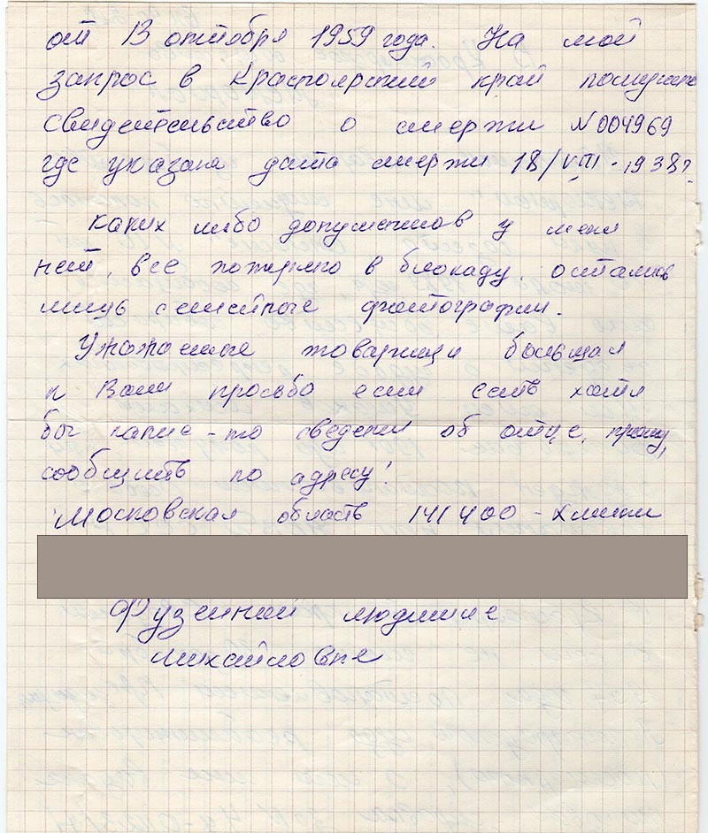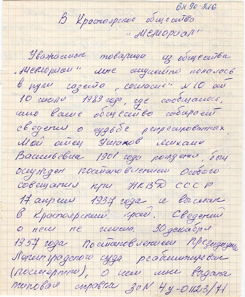 Уважаемые товарищи из общества «Мемориал» мне случайно попалась в руки газета «Согласие» № 10 от 10 июля 1989 года, где сообщалось, что ваше общество собирает сведения о судьбе репрессированных. Мой отец Ушаков Михаил Васильевич 1901 года рождения, был осуждён постановлением Особого совещания при НКВД СССР 17 апреля 1937 года и выслан в Красноярский край. Сведений о нём не имела. 30 декабря 1957 года Постановлением Президиума Ленинградского суда реабилитирован (посмертно), о чём мне выдана типовая справка за № 4у- 01123/71 от 13 октября 1959 года. На мой запрос в Красноярский край получено свидетельство о смерти №004969 где указана дата смерти 18/VIII 1938 г.