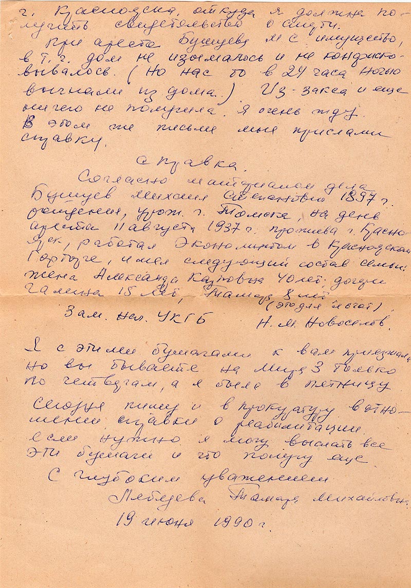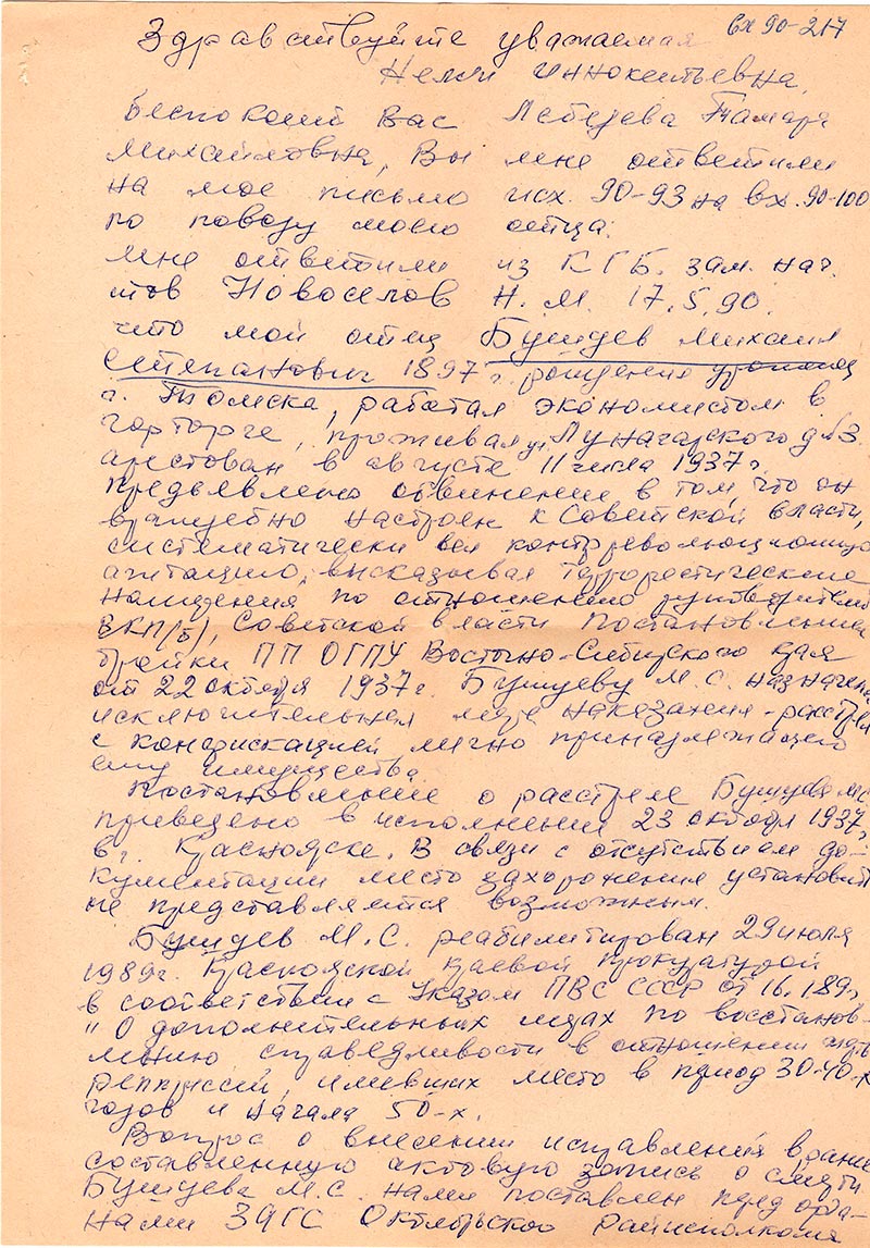 Мне ответили из КГБ зам нач. тов. Новоселов Н.М. 17.5.90 что мой отец Бушуев