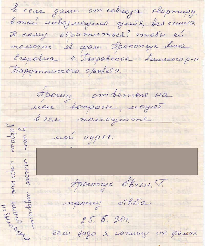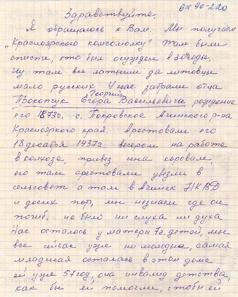 Я обращаюсь к Вам. Мы получаем «Красноярскую комсомолку» там были списки, кто был осужден в 30е годы. Ну там все латыши да литовцы мало русских. У нас забрали отца Прокопчук Егора (Георгий) Васильевича рождение его 1873 г. с. Покровское Ачинского района Красноярского края. Арестовали его 18 декабря 1937 г. вечером на работе в колхозе, привез сена коровам, его там арестовали увезли в сельсовет а там в Ачинск НКВД и досих пор, мы незнаем где он погиб, не было ни слуха ни духа. На осталось у матери 7 ч. Детей, мы все сейчас уже ни молодые, самая младшая осталась в этом доме ей уже 57 год, она инвалид детства, как бы ей помогли, чтобы ей в селе дали от совхоза квартиру, в той нивозможно жить, вся сгнила. К кому обратиться? Чтобы ей помогли её фам. Прокопчук Анна Егоровна с. Покровское Ачинского р-н Тарутинского с/совета.