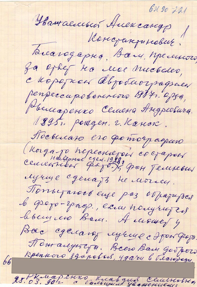 Благодарна Вам премного, за ответ на мое письмо, с короткой автобиографией репрессированного 1937 г. отца Рымаренко Семена Андреевича 189 5 г. рожденю г. Канск. Посылаю его фотографию (когда-то переснятой со старой семейной фото наверное сдел. 1928 г. фон темный лучше сделать не могли. Попытаюсь еще раз обратиться в фотограф., если получится вышлю Вам. А может у Вас сделают лучше с этой фото. Пожалуйста. Всего Вам доброго, крепкого здоровья, удачи в благородном деле.