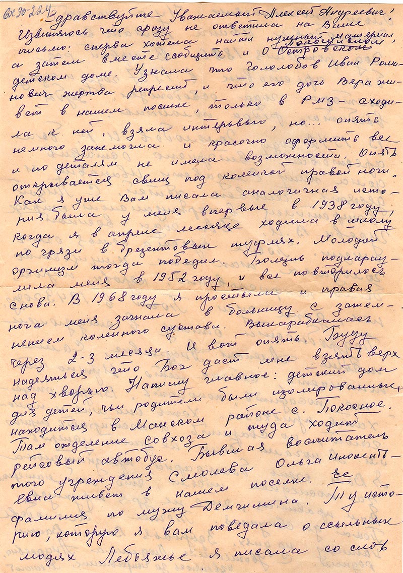 Здравствуйте Уважаемый Алексей Андреевич! Извиняюсь что сразу не ответила на Ваше письмо: сперва хотела найти нужный материал, а затем вместе сообщить и о Островском Покосинском детском доме. Узнала что Гололобов Иван Романович жертва репресий, и что его дочь Вера живет в нашем поселке, только в РМЗ – сходила к ней, взяла интервью, но… опять немного занемогла и красочно оформить все и по деталям не имела возможности. Опять открывается свищ под коленкой правой ноги. Как я уже Вам писала аналогичная история была у меня впервые в 1938 году, когда я в апреле месяце ходила в школу по грязи в брезентовых туфлях. Молодой организм тогда победил. Болезнь подкараулила меня в 1952 году, и все повторилось снова. В 1968 году я простыла и правая нога загнала меня в больницу с затемнением коленного сустава. Выкарабкалась через 2-3 месяца. И вот опять. Буду надеяться что Бог даст мне взять верх над хворью. Напишу главное: детский дом для детей, чьи родители были изолированные, находится в Манском районе с. Покосное. Там отделение совхоза и туда ходит рейсовый автобус. Бывшая воспитатель того учреждения Смолева Ольга Инокентьевна живет в нашем поселке. Ее фамилия по мужу Демчишина. Ту историю, которую я Вам поведала о ссыльных людях Лебяжье я написала со слов Ольги Инокентьевны. Ну а насчет Гололобова Ивана Романовича: Год рождения 1896. В первый раз был арестован в 1937 году и через полтора года освобожден. Зубы выбиты, ребра поломаны.
