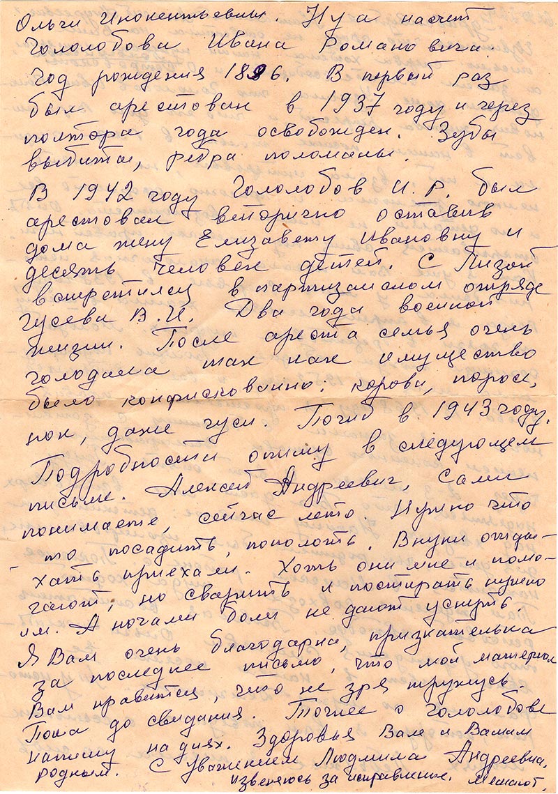 В 1942 году Гололобов И.Р. был арестован вторично оставив дома жену Елизавету Ивановну и десять человек детей. С Лизой встретился в партизанском отряде Гусева В.И. Два года военной жизни. После ареста семья очень голодала так как имущество было конфискованно: корова, поросенок, даже гуси. Погиб в 1943 году. Подробности опишу в следующем письме. Алексей Андреевич, сами понимаете, сейчас лето. Нужно что-то посадить, пополоть. Внуки отдыхать приехали. Хоть она мне и помогают, но сварить и постирать нужно им. А ночами боли не дают уснуть. Я Вам очень благодарна, признательна за последнее письмо, что мой материал Вам нравится, что не зря тружусь.
